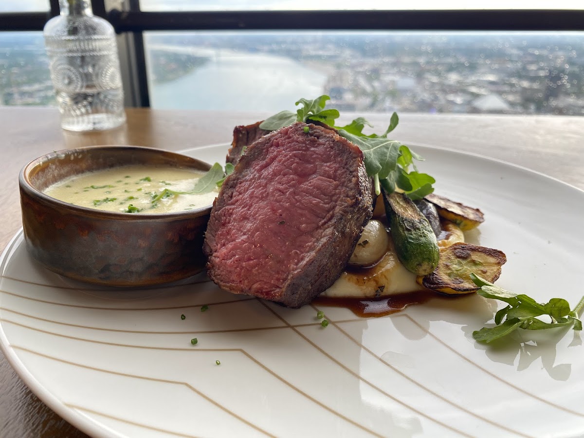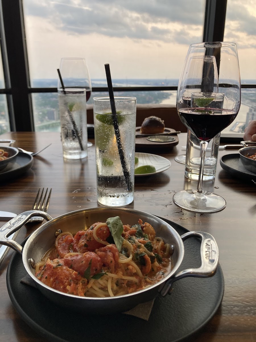Didnt get to eat but the service, views and drinks did not disappoint. The menu sounded great but was certainly on the higher end side. Would love to go back and dine on a future visit for.sure. If you are close and the weather is clear go up for the views! PS- its not easy to find the elevator and it is glass all the way up so be ready for a little adventure to get there.
